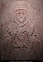 This terracotta bas-relief of beloved Saint Francis of Assisi with five hummingbirds was shown in the 2020 competitive annual exhibition hosted by The Society of Portrait Sculptors (London) and elsewhere. Each cast has its own unique imperfections. Notched on the back for wall display, if desired. It has also been exhibited in custom framing, mounted upright on a metal stand, and placed outdoors in gardens.